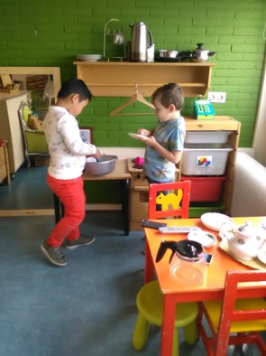 De huishoek wordt vaak gekozen. De nieuwe (ouderwetse) echte materialen vinden ze erg leuk. Er zijn nog maar 3 kopjes gesneuveld. ;-) Dat er ook water in de koffiekan mag is helemaal leuk. Niet teveel hoor. Tot het 3de streepje, dus er moet goed gemeten worden. Er wordt afgewassen, soep gekookt, thee gedronken, gedweild, de was gedaan en ramen gelapt.