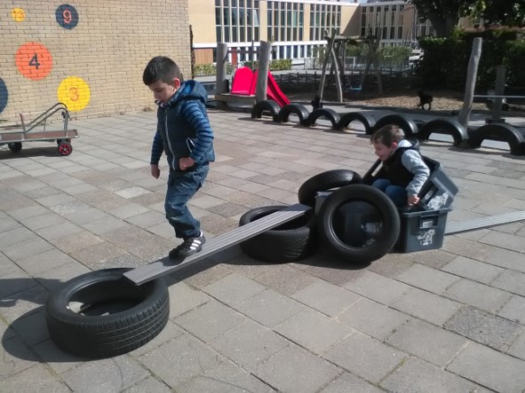 Een spel in de kring om de voorzetsels nog eens te herhalen: Op je stoel, achter je stoel, naast, onder, links van je stoel enz.