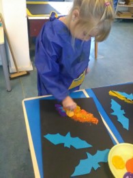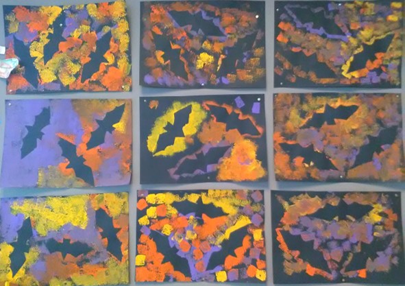 In het themaboek "Bang mannetje" zien we ook tekeningen van vleermuizen. De kinderen hebben nog nooit echte vleermuizen gezien. Op het digibord kijken we een film over deze interessante dieren. Tijdens de werkles worden er vleermuizen gemaakt. Eén groep gaat sjabloneren. De uitgeknipte vleermuizen worden op zwart papier gelegd en met sponsjes stempelen ze er met verschillende kleuren verf overheen. Als het papier vol is worden de vleermuizen weggehaald. Voilà.