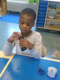 De andere groep is begonnen met het knutselen van vleermuizen van een wc-rolletje met vleugels van een harmonicavouw. Van het filmpje hebben we geleerd dat vleermuizen graag ondersteboven hangen.