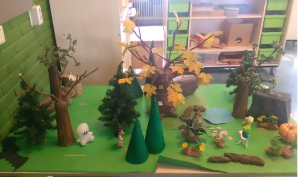 De toverboom, bang mannetje, het spook, de draak, de spin, de heks enz. zijn van de kijktafel verhuisd naar de vertel/speeltafel. Daar is het wilde woeste woud gemaakt en hier kunnen de kinderen het verhaal naspelen.