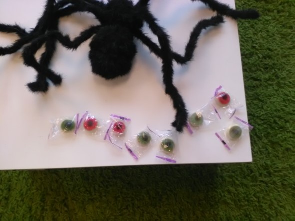 Deze tas heb ik lang geleden gekregen van een vreemd oud vrouwtje met een rare kromme neus, een hoge puntmuts en vreemde kleren. Ik ontmoette haar toen ik met mijn zoon na een boswandeling even ging uitrusten op een bankje. Daar zat ze zachtjes te huilen omdat ze haar bezem kwijt was. Na lang zoeken vonden we de bezem in een dikke boom. Als dank kreeg ik deze tas, met de waarschuwing hem maar weinig te gebruiken. In de tas zat een heel mooi stokje en we dachten dat het een tovertas moest zijn. Met z'n allen hebben we allerlei toverspreuken bedacht en geprobeerd en uitendelijk is het gelukt: We hebben snoepjes getoverd. Hele enge snoepjes. Griezelige ogen. Maar ze waren wel erg lekker.