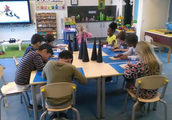 Er worden heksen geknutseld van kegels. Omdat we weer een korte week hadden door de studiedag maakten we er een klassikale activiteit van. Er wordt geknipt, geprikt, getekend en geplakt.
