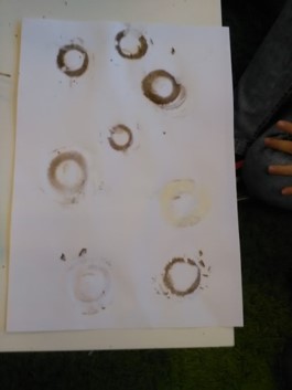 De paddenstoelen zijn na het weekend helemaal verschrompeld. Als de paddenstoelhoeden voorzichtig worden opgetild zien we afdrukken op het papier. Dat zijn de sporen. Wat zijn ze maar klein. We kunnen ze nauwelijks zien. Gek idee dat daar weer nieuwe paddenstoelen uit kunnen groeien. Heel vreemd: bij één van de paddenstoelen zijn de sporen wit en bij alle anderen bruin. Het leek toch echt eenzelfde soort. ????