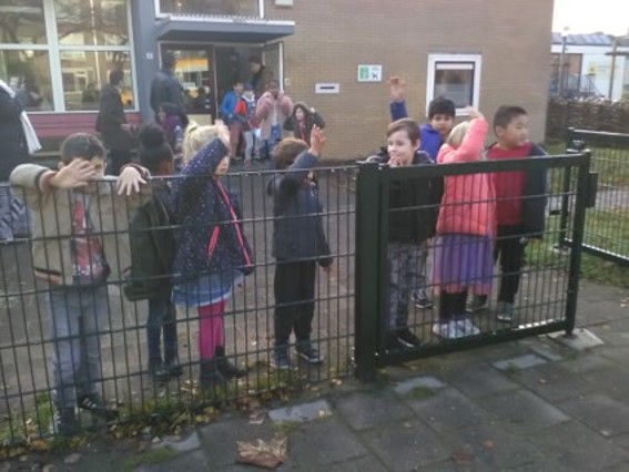 Tussen de bedrijven door zwaaien we ook nog even de groepen paars en blauw uit die op schoolreis gaan.