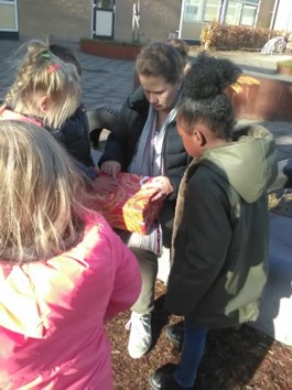 Er is nog tijd om even buiten te spelen. Wat is dat? Er liggen pakjes op het schoolplein. Zeker komen aanwaaien.