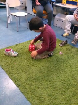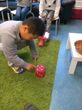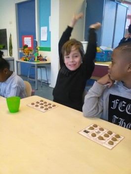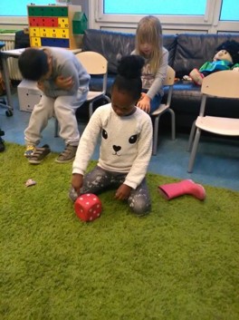 Lisa heeft een enorme behoefte om alles wat ze ziet te tellen: de tafels, de kinderen, de haren op het hoofd van de juf enz. Haar favoriete speelgoed is een dobbelsteen. Deze week kwam Lisa met ons een spelletje pepernoottellen doen. Alle kinderen trekken één schoen uit en mogen om beurten met de dobbelsteen gooien. Als je 3 gooit mag je 3 pepernoten in je schoen doen enz. Als iedereen geweest is tellen we de pepernoten. Wie heeft er de meeste en wie de minste? Om het eerlijk te houden willen we allemaal evenveel pepernoten. Allemaal 10. Als je er al 5 hebt, hoeveel krijg je er dan bij? En hoeveel als je er 4 hebt. Dit laatste stukje was nog best moeilijk. Het opeten was wel weer makkelijk. Als je 5 pepernoten hebt en je eet er 2 op hoeveel heb je er dan nog over?