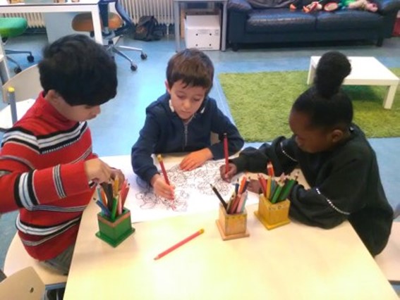 Sinterklaas geeft altijd cadeautjes weg op zijn verjaardag i.p.v. dat hij een cadeau krijgt. We maken een verrassing voor hem. 4 mooie placemats. Eén voor hemzelf en er kunnen ook nog 3 Pieten meeëten. Er wordt 2 aan 2 en door een groepje van 3 samengewerkt aan een kleurplaat. Goede afspraken maken over welke kleur de muts van Piet moet worden of wie het eerst het rode kleurpotlood mag gebruiken is best een hele opgave, maar het is gelukt.