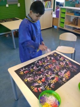 Het belangrijkste gespreksonderwerp van deze kring is toch het vuurwerk. Op het digibord kijken we nog eens naar een mooie vuurwerkshow. Tijdens de werkles wordt er vuurwerk gestempeld. We maken daarvoor zelf een vuurwerkstempel van een wc-rolletje.