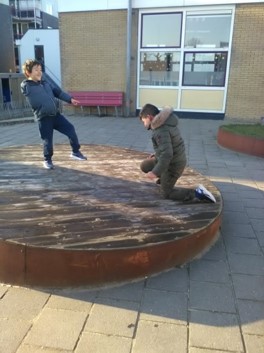 Het is droog maar erg koud buiten. De kinderen hebben er geen last van. Ze ontdekken stukjes ijs en laten die smelten in het zonnetje.