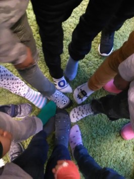 Er staan soms ook cijfers op de schoenen bv. 28, 30 of 33. We hebben ook schoenen waar 44 op staat. Oei, die zijn groot. Juf Bianca trekt de schoenen aan, maar die zijn veel te groot voor haar. De schoenen van Andy en van Tygo zijn weer veel te klein.