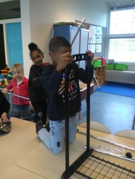 We gaan bij dit thema een kledingwinkel maken. Met een schoenenafdeling. Dat betekent dus weer een hele verbouwing. Eerst wordt er een lijst gemaakt met benodigdheden en we zoeken de hele school af naar dingen die we kunnen gebruiken. O kijk, wat een mooie kast. Daar zouden de schoenen mooi in kunnen.