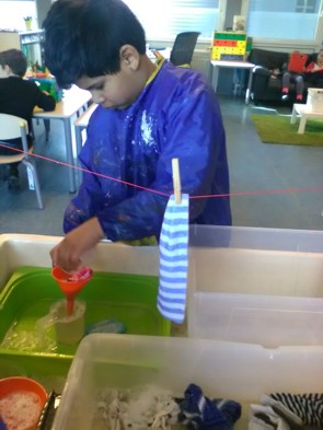 Vorige week hebben we de wasmachine goed bekeken. Deze week kunnen we in de klas ook de was doen. Wel de handwas. Er wordt sop gemaakt en de poppenkleren krijgen (meerdere keren) een wasbeurt. Inzepen, uitspoelen, uitwringen en ophangen.