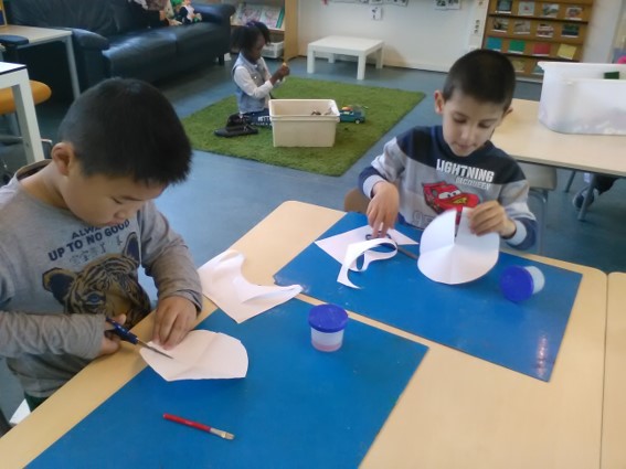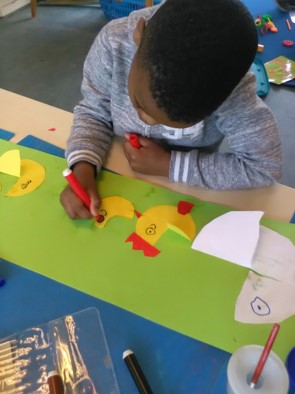 Tijdens de werkles worden Dottie en haar kuikens gevouwen, getekend, geknipt en geplakt.