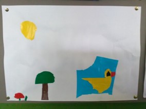 Van het geverfde papier wordt een grasveld met een vijver gemaakt. Kunnen onze eendjes lekker zwemmen.