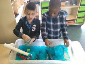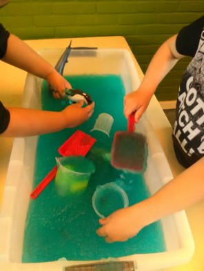 De glibberbak is een groot succes bij een aantal kinderen. Sommigen zijn er niet bij weg te slaan. Anderen lopen er met een grote boog omheen. Het is ook wel een heel raar gevoel.