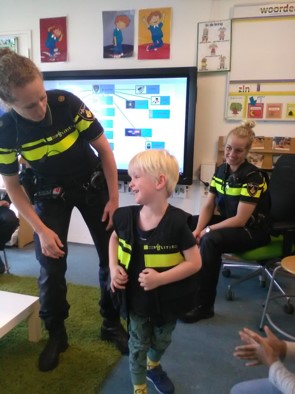 We krijgen ruim de gelegenheid om te bekijken hoe ze er uit zien en wat ze allemaal bij zich hebben: Een wapenstok, handboeien, pepperspray, een portofoon. En ook een pistool. De agenten vertellen dat ze het pistool bijna nooit gebruiken. Alle anderen dingen mogen we bekijken en vasthouden maar het pistool moet in de holster blijven.