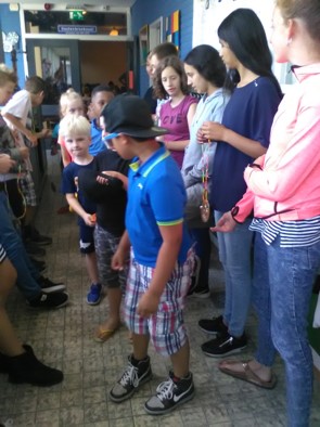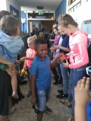 Na afloop geven we onze geknutselde bling-blingkettingen aan de schoolverlaters.