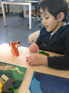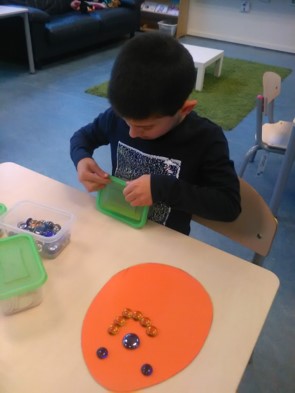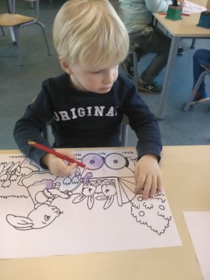 Een aantal kinderen had vorige week geen tijd om te plakken met de paaseiplakkertjes. Ze wilden het graag ook nog doen. De eitjes worden goed verstopt: achter de boom, op de rug van de kat, onder de eend, naast het paard enz. Ondertussen vertellen ze elkaar hele verhalen.