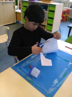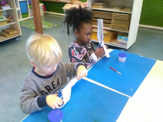 Het was ook hard nodig om onze voorraad geverfd papier aan te vullen. Alles is opgegaan aan verschillende knutselwerkjes. De vellen papier worden beschilderd met verschillende kleuren en materialen: Met grote kwasten, met wc-rolletjes, sponsjes, enz.