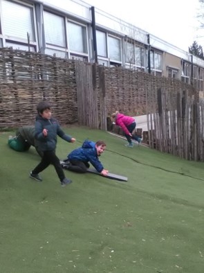 Bij het buitenspelen zijn de laatste tijd vooral de planken en de kratten de favoriete spelmaterialen. Er worden steeds weer nieuwe spelletjes mee bedacht.