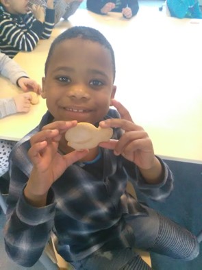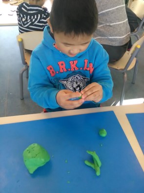 Boetseren met natuurklei en stokjes. Zonder opdracht. Ze bedenken zelf de leukste dingen. Dit groepje maakt allemaal lekkere dingen: Saté-tjes, cupcakes, ijsjes, lollie's, koekjes, pannenkoeken.