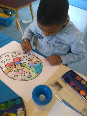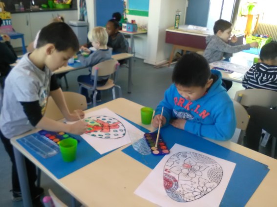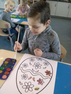 Paaseieren schilderen met waterverf. Sommige kinderen maken er 2 en één kind zelfs 3 ( en 's middags nog één en de volgende dag nog 2 enz.)