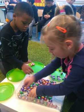 Snoes uit het rekenkastje heeft een grote zak chocoladepaaseitjes meegenomen. Dat zijn er veel. Hoeveel? Kunnen we ze tellen? Dat is veel te moeilijk. Het zijn er zoveel dat we in de war raken. Er zijn 4 verschillende soorten. Waar zijn de meeste van en van welke de minste? Daar kunnen we het beste achter komen door ze eerst te sorteren. Dan zien we het meteen. Van de paarse zijn de meeste en van de oranje de minste. Van de rose en de groene lijken er evenveel te zijn, maar als we ze tellen weten we dat er 4 rose meer zijn dan groene.