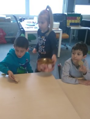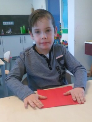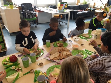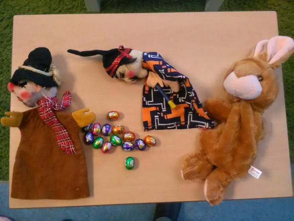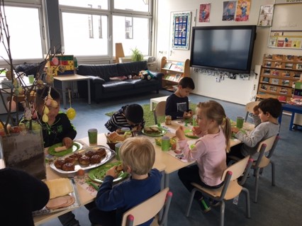 Paaslunch: Samen van 3 tafels 1 lange tafel maken. Hoeveel stoelen hebben we nodig voor alle kinderen en juffen? En ook nog 1 extra stoel voor onze gast: juf Joanne. Samen de borden, bekers en bestek tellen en klaarzetten, het brood in de manden doen, de eieren tellen. Wat een voorpret. Als alles klaar is gaat iedereen tevreden aan tafel. Er is lang en gezellig getafeld. Tussendoor kwam Jonne afscheid nemen en hij trakteerde ons op een chocolade paashaas lolly.