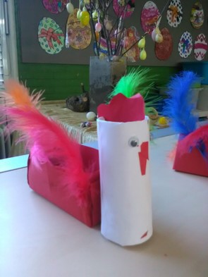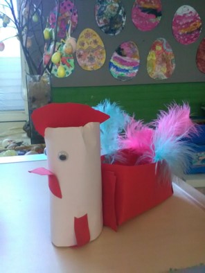 We weten dat de Paashaas zelf geen eieren kan leggen. Daar heeft hij de hulp van een kip voor nodig. We vouwen een bakje en van een wc-rolletje wordt een kip gemaakt. Zo maken we een kippenpaasmandje.