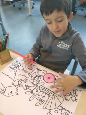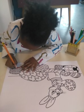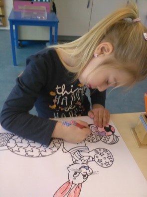 Omdat we bij het kerstdiner zelfgemaakte place-mats hadden vinden de kinderen dat we die ook voor de Paaslunch moeten maken. Er wordt ijverig gekleurd en ze zijn gelukkig allemaal op tijd klaar.