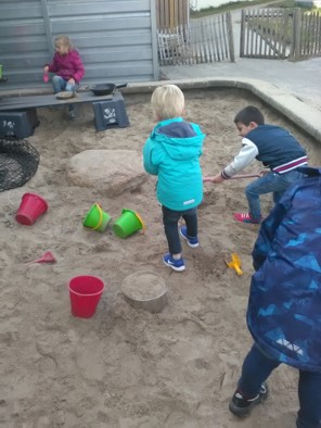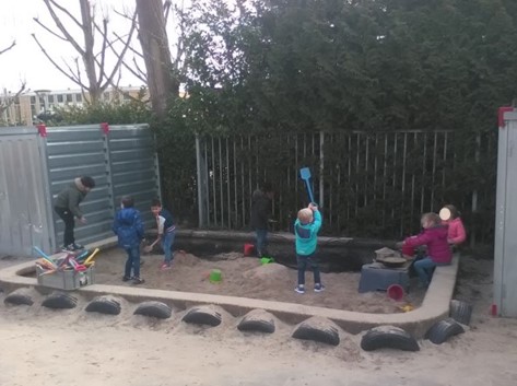 Maandag is het heerlijk weer. Het lijkt eindelijk echt lente. We genieten van het buitenspelen. Vooral nu de zandbak weer open is.