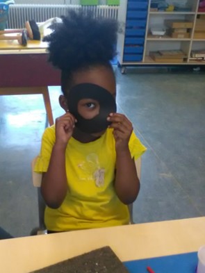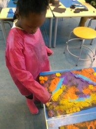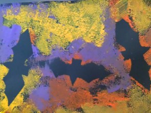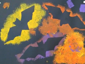 In het themaboek "Bang mannetje" zien we ook tekeningen van vleermuizen. De kinderen hebben nog nooit echte vleermuizen gezien. Op het digibord kijken we een film over deze interessante dieren. Tijdens de werkles worden er vleermuizen gemaakt. Eén groep gaat sjabloneren. De uitgeknipte vleermuizen worden op zwart papier gelegd en met sponsjes stempelen ze er met verschillende kleuren verf overheen. Als het papier vol is worden de vleermuizen weggehaald. Voilà.