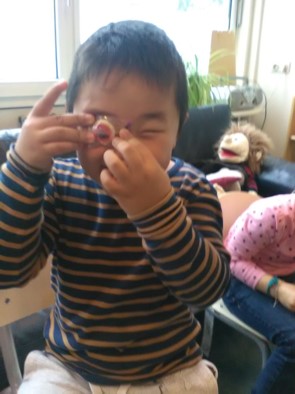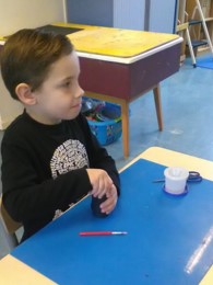 We gaan met z'n allen een grote draak maken. Iedereen helpt mee. We gaan eerst verven dus allemaal een schort aan. Wat kunnen ze elkaar al goed helpen met aantrekken en dichtdoen.