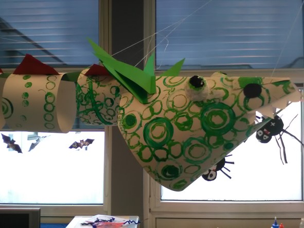 Vorige week hebben we grote vellen papier gestempeld met verschillende tinten groen. Nadat deze gedroogd zijn, zijn ze in lange stoken geknipt en daarvan is een hele grote draak gemaakt.