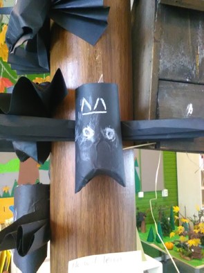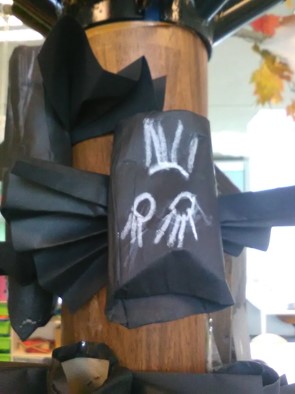 Je zou bijna de klas niet meer in durven. Kijk eens naar onze deur. Wat een monster. En als je toch binnenkomt vliegen de spoken je om de oren.