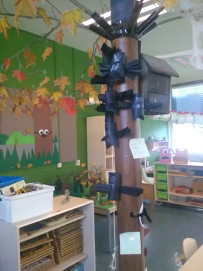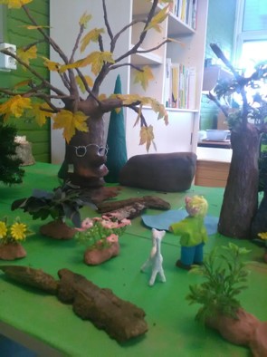 De toverboom, bang mannetje, het spook, de draak, de spin, de heks enz. zijn van de kijktafel verhuisd naar de vertel/speeltafel. Daar is het wilde woeste woud gemaakt en hier kunnen de kinderen het verhaal naspelen.