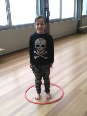 Tot slot een paar rondjes hoepeldans. Dit is stoelendans met hoepels i.pv. stoelen.