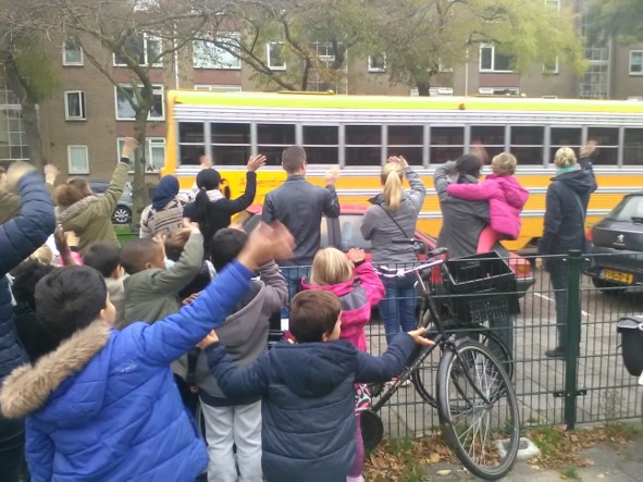 Vrijdag gaan de groepen groen en wit op schoolreis. Natuurlijk zwaaien we ze uit. Daaag, veel plezier.