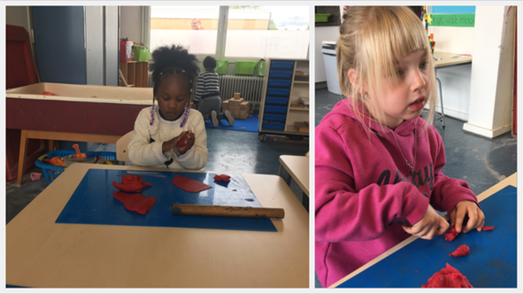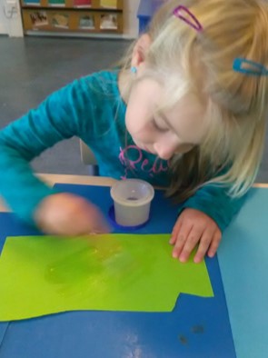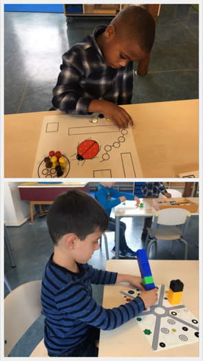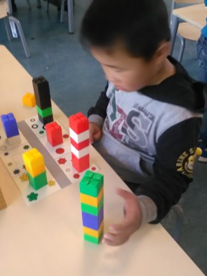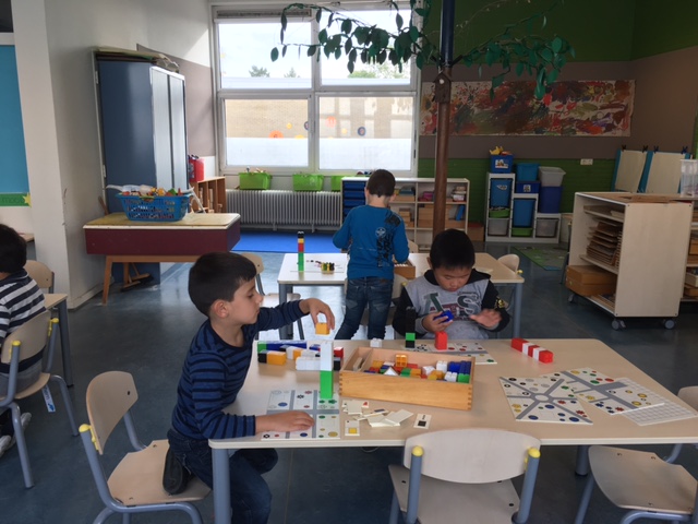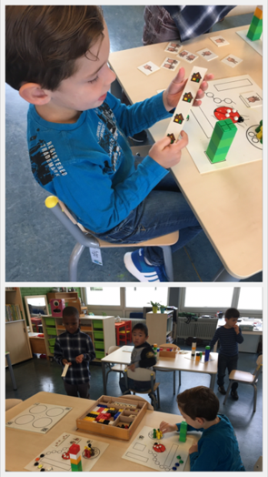 Terwijl de ene groep met hun boek bezig is zijn de andere kinderen aan het werk met materialen uit de rekenkast. Ze krijgen verschillende opdrachten met vooral teloefeningen.