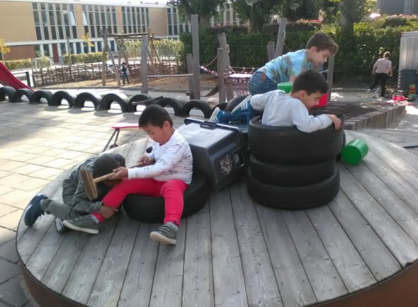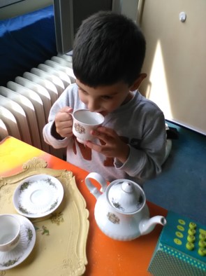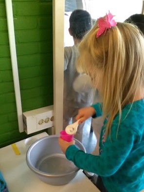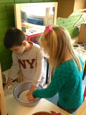 De huishoek wordt vaak gekozen. De nieuwe (ouderwetse) echte materialen vinden ze erg leuk. Er zijn nog maar 3 kopjes gesneuveld. ;-) Dat er ook water in de koffiekan mag is helemaal leuk. Niet teveel hoor. Tot het 3de streepje, dus er moet goed gemeten worden. Er wordt afgewassen, soep gekookt, thee gedronken, gedweild, de was gedaan en ramen gelapt.