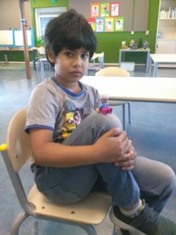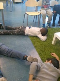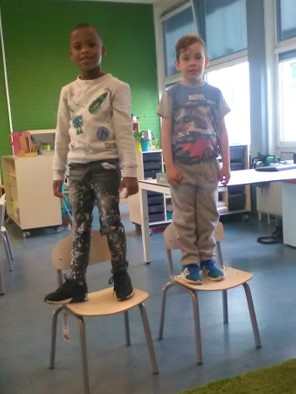 Een spel in de kring om de voorzetsels nog eens te herhalen: Op je stoel, achter je stoel, naast, onder, links van je stoel enz.