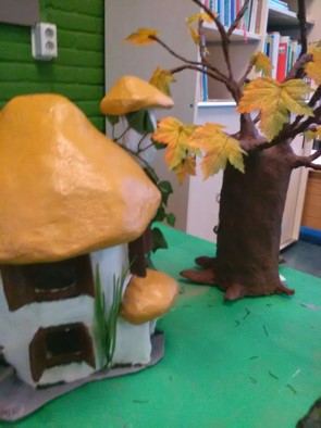 Ook de vertel/speeltafel is nu een herfstbos. De toverboom mag nog even blijven staan. Hij heeft immers ook herfstblaadjes en past er goed bij. De heks en bang mannetje zwerven ook nog rond, maar er zijn ook kabouters en paddenstoelspeelhuisjes bijgekomen. Ik ben benieuwd welke avonturen er gespeeld gaan worden.