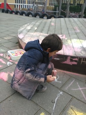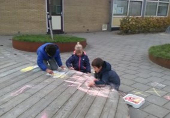 Het plein wordt mooi versierd met stoepkrijt.