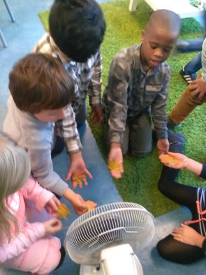 Met een ventilator gaat het nog beter. Zo maken we een storm en komen de blaadjes veel hoger en verder.