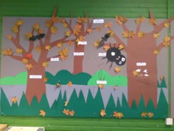 Van het thema "Bang mannetje" naar het thema "Herfst" is maar een heel klein stapje. Er hoeft maar weinig aangepast te worden in de klas. Ons themaprikbord is niet langer het Wilde Woeste Woud maar een herfstbos. Zoals u ziet hebben we al een aantal herfstwoorden kunnen opprikken.