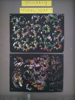 Het belangrijkste gespreksonderwerp van deze kring is toch het vuurwerk. Op het digibord kijken we nog eens naar een mooie vuurwerkshow. Tijdens de werkles wordt er vuurwerk gestempeld. We maken daarvoor zelf een vuurwerkstempel van een wc-rolletje.