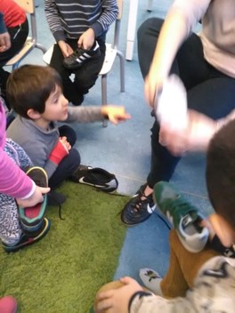 Er staan soms ook cijfers op de schoenen bv. 28, 30 of 33. We hebben ook schoenen waar 44 op staat. Oei, die zijn groot. Juf Bianca trekt de schoenen aan, maar die zijn veel te groot voor haar. De schoenen van Andy en van Tygo zijn weer veel te klein.