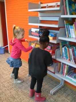 Er staan spelletjes in de kast, maar gelukkig maakt Juf Petra een plekje vrij in haar kantoor. Voorlopig gaan de spelletjes daarheen en mag de kast naar ons lokaal.