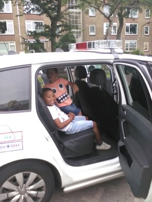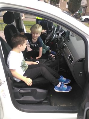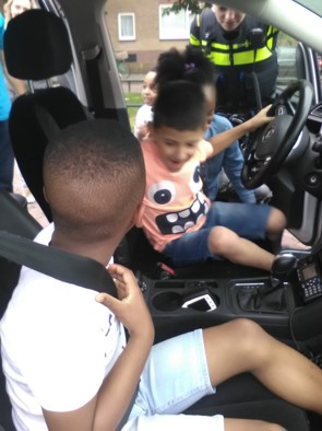 We mogen allemaal even in de politieauto zitten.